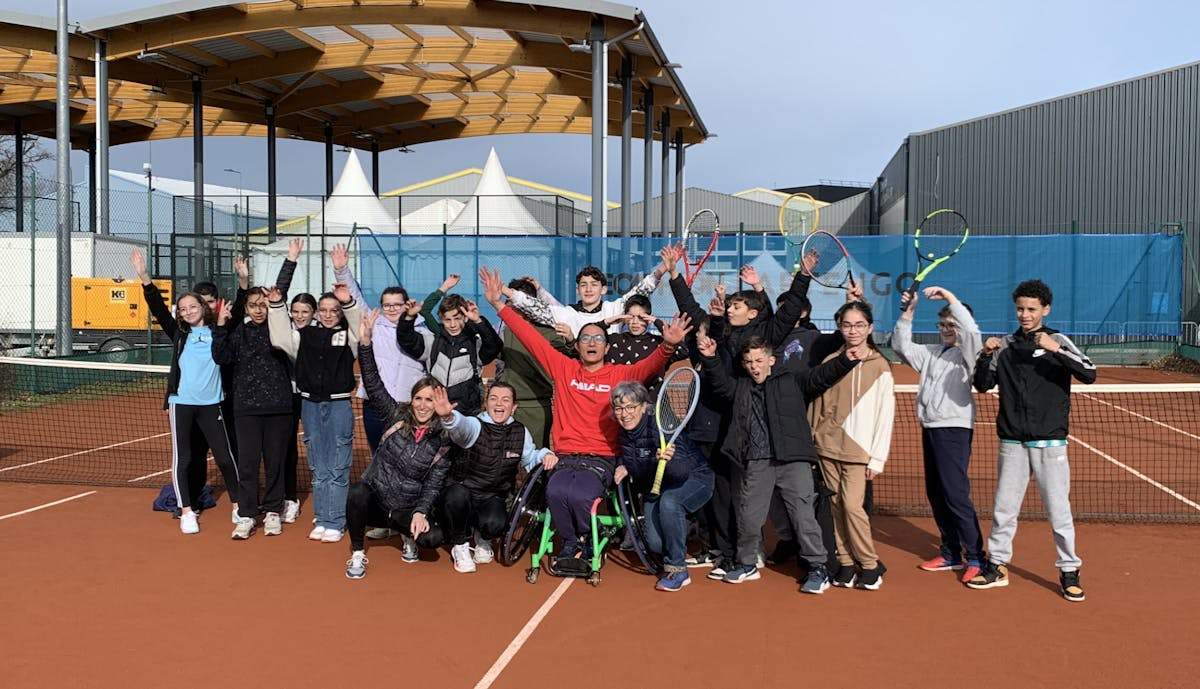 Inclusion Tennis Fauteuil d'un public de jeunes collégiens de 6èmes en marge du TCAB Engie Open Andrezieux Bouthéon 42 en collaboration avec la Ligue Auvergne-Rhône-Alpes de Tennis et le joueur Nico Pagès (Rtc Romagnat Tennis Club) sont moteurs dans la Loire sur cette discipline associée. Notre objectif permanent : ouvrir le tennis à tous, partout et créer du lien social en appui aux communes ligériennes ...